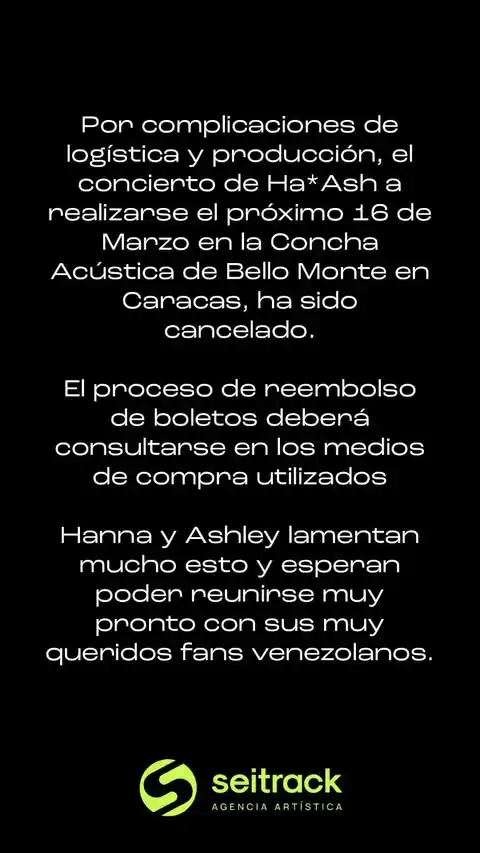 El dueto mexicano Ha*Ash anunció que su concierto en Caracas previsto para el 16 de marzo fue cancelado. La confirmación la dieron a conocer la productora de eventos Agte Live Entertaiment y la agencia de representación artística Seitrack en sus redes sociales