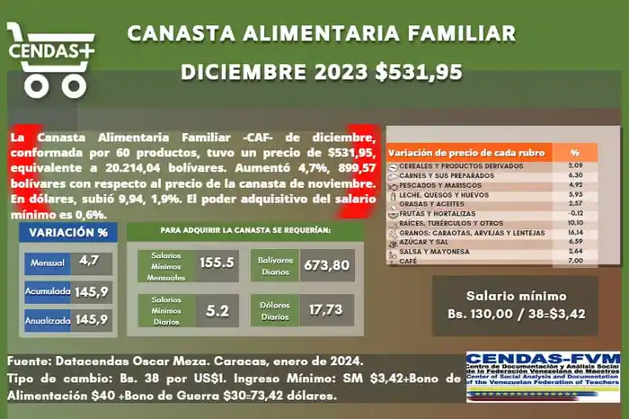 Y este aumento lo corrobora el Centro de Documentación y Análisis de la Federación Venezolana de Maestros (Cendas-FVM) que determinó que para diciembre del 2023, el costo de la Canasta Alimentaria Familiar se ubicó en 531,95 dólares.