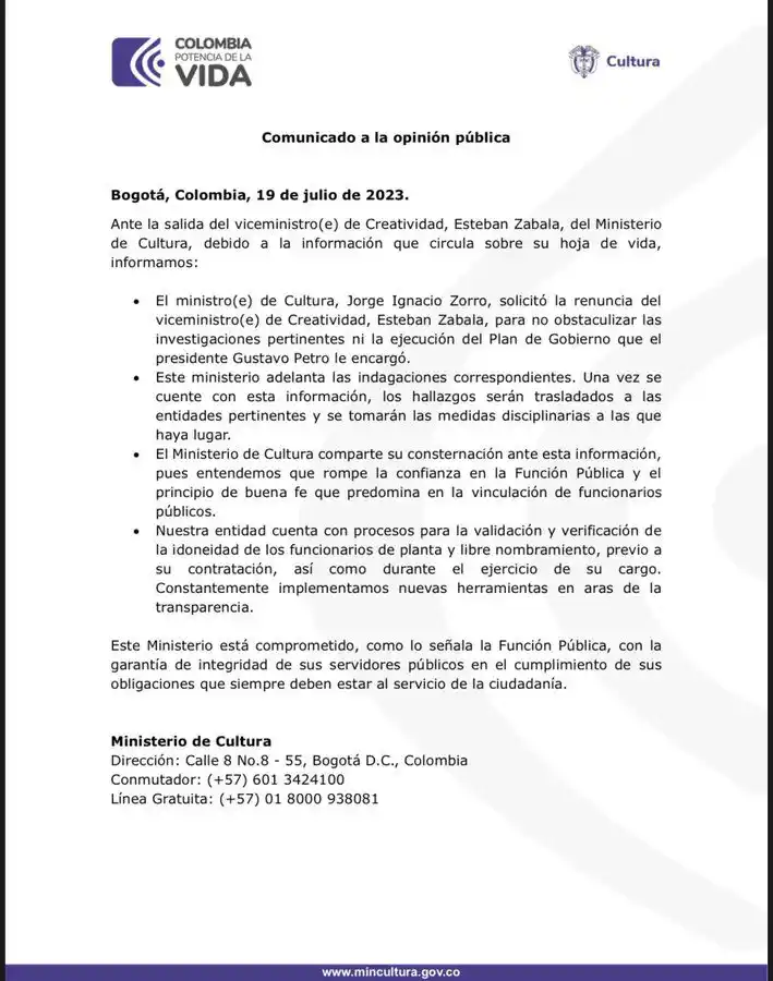 Mediante un comunicado oficial, el Ministerio de Cultura dio a conocer que el ministro Jorge Ignacio Zorro pidió la renuncia de Esteban Zabala para «no obstaculizar las investigaciones pertinentes ni la ejecución al Plan de Gobierno que el presidente Gustavo Petro le encargó».
