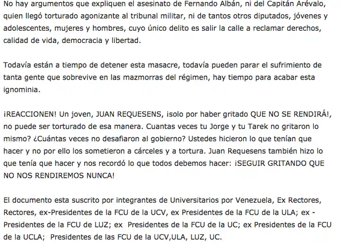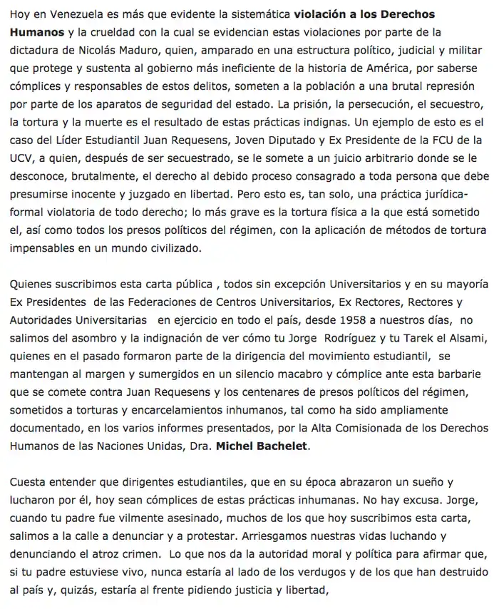 El 26 de agosto, dirigentes universitarios exigieron la liberación del diputado y denunciaron la violación de sus derechos humanos. Emitieron una carta pública dirigida a Jorge Rodríguez y a Tareck El Aisami.