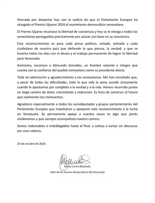 También dijo estar «honrada por despertar hoy con la noticia de que se ha otorgado el Premio Sájarov 2024 al movimiento democrático venezolano. Somos indomables e indoblegables hasta el final, y vamos a luchar sin descanso por esos valores», destacó.