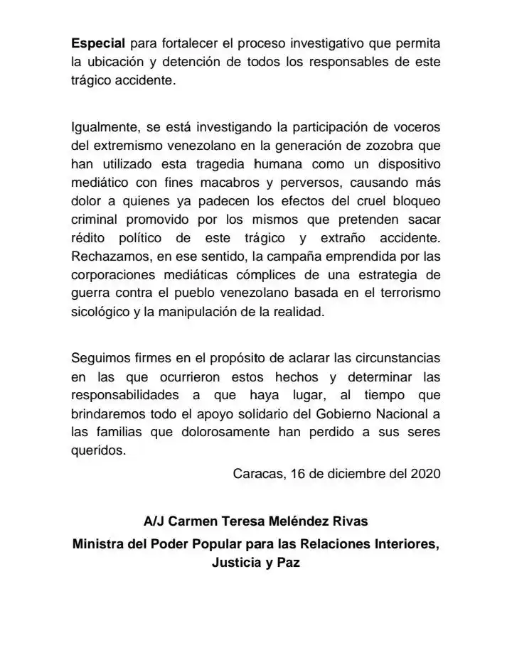 «Se está investigando la participación de voceros del extremismo venezolano en la generación de zozobra. Utilizan esta tragedia humana como un dispositivo mediático con fines macabros y perversos. Causan más dolor a quienes ya padecen los efectos del cruel bloqueo criminal (sanciones económicas)», sostiene.