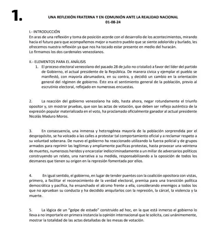 Los cardenales Baltazar Porras y Diego Padrón emitieron un comunicado conjunto donde afirman que el 28 de julio el pueblo votó abrumadoramente y fijan posición al respecto.