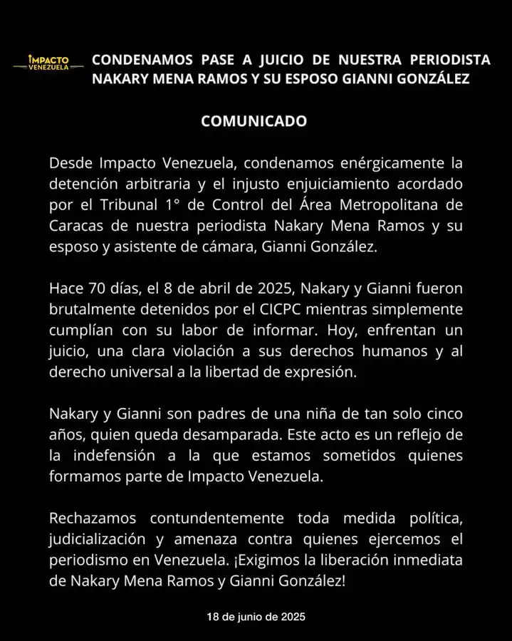 El Tribunal 1° de Control del Área Metropolitana de Caracas dictó privativa de libertad y ordenó el pase a juicio contra la periodista de Impacto Venezuela, Nakary Mena Ramos, y su esposo Gianni González, quien le asistía en cámara.
