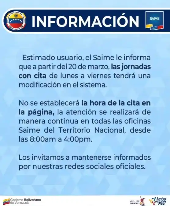 Ahora, en las jornadas de atención de lunes a viernes, ya no asignarán horas específicas para las citas. La atención será continua en todas las oficinas del Saime a nivel nacional, desde las 8:00 a.m. hasta las 4:00 p.m.