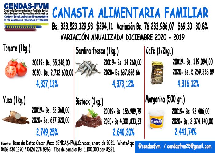 El precio de la Canasta Alimentaria Familiar (CAF) de diciembre de 2020 se ubicó en US$294,11. Es decir en 323.523.329,93 bolívares. La información la dio a conocer el Centro de Documentación y Análisis Social de la Federación Venezolana de Maestros (Cendas-FVM).