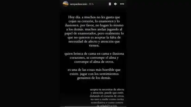 “Hoy día, a muchos no les gusta que cojan su corazón, lo enamoren, lo ilusionen y lo tiren al piso. Por favor, no hagan eso con nadie. Muchos andan jugando al papel de enamorados, pero realmente lo que no quieren es aceptar la falta de necesidad de afecto y atención que tienen”, comenzó diciendo en el escrito que publicó en sus ‘stories’ de Instagram.