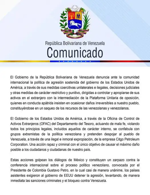 «El Gobierno de los Estados Unidos de América, a través de la Oficina de Control de Activos Extranjeros (OFAC) del Departamento del Tesoro, actuando de mala fe, violando todos los principios legales, incluidos aquellos de carácter interno, se confabula con grupos extremistas de la política venezolana y pretenden despojar al pueblo de Venezuela, a través de una ilegal e inmoral expropiación, de la empresa Citgo Petroleum Corporation. Una acción rapaz y criminal con el único objetivo de causar el máximo daño posible a los ciudadanos y ciudadanas de nuestro país», señala un comunicado publicado por la cancillería en sus redes sociales.