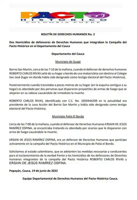 «Solicitamos al estado colombiano, que se adelanten las medidas necesarias y conducentes para el esclarecimiento de la verdad frente a los homicidios de los defensores de Derechos Humanos integrantes de la campaña del Pacto Histórico, Roberto Carlos Rivas y Ersain de Jesús Ramírez Ospina».