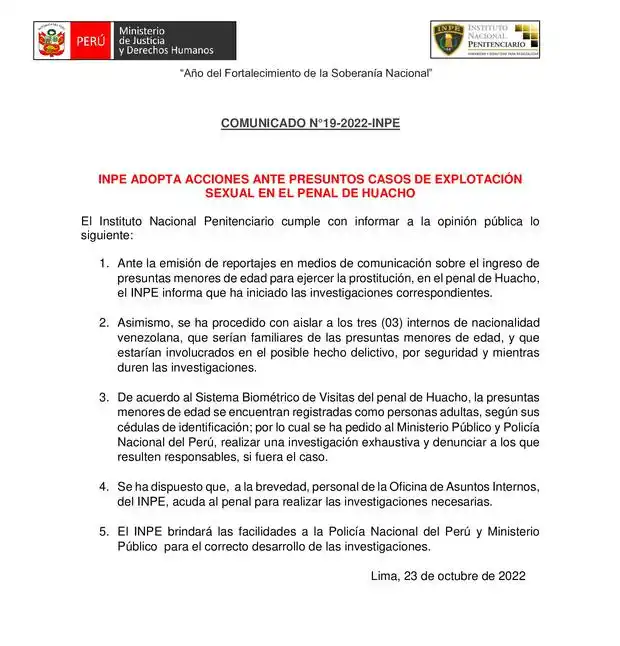 El INPE anunció que se llevarán a cabo las investigaciones correspondientes; tras revelarse que menores de edad eran llevadas al penal de Huacho.