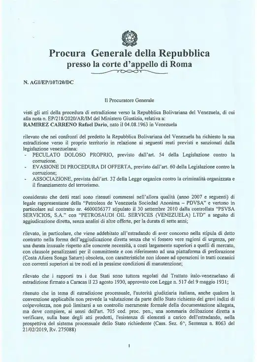 A su vez, en el 2020, la Sala de Casación Penal del Tribunal Supremo de Justicia (TSJ), declaró procedente la solicitud de extradición de Ramírez Carreño a la república italiana.