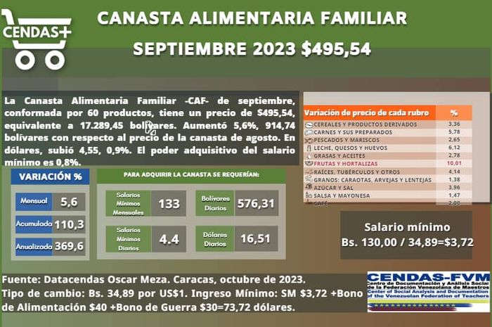 El Cendas FVM señala que la canasta aumentó 110,5% de enero a septiembre y 369,6% de septiembre del 2022 a septiembre del 2023.