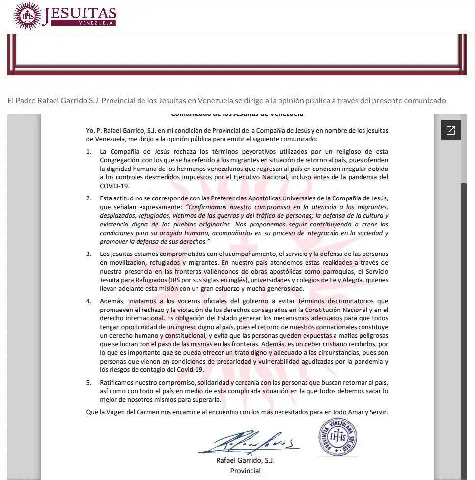 La respuesta de los Jesuitas en Venezuela no se hizo esperar y, mediante un comunicado, rechazaron estas «expresiones peyorativas» que «ofenden la dignidad de los hermanos venezolanos que regresan al país en condición irregular, debido a los controles desmedidos impuestos por el Ejecutivo, incluso antes de la pandemia de la COVID-19», señala el escrito.