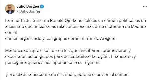 Tras conocerse un operativo del Gobierno de Chile para capturar a miembros del Tren de Aragua que participaron en el asesinato del teniente Ronald Ojeda, el dirigente político venezolano Julio Borges reaccionó a acusaciones del oficialismo que lo vinculan con el grupo delictivo.