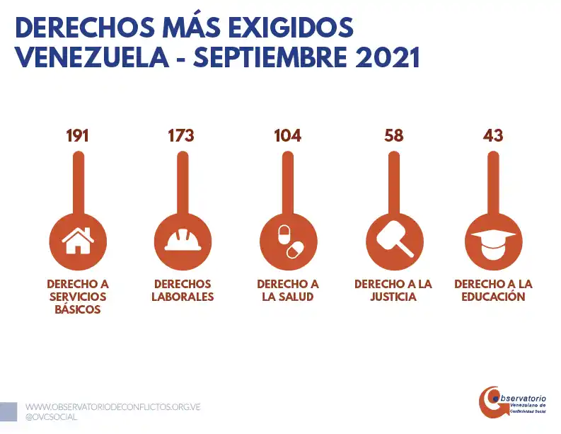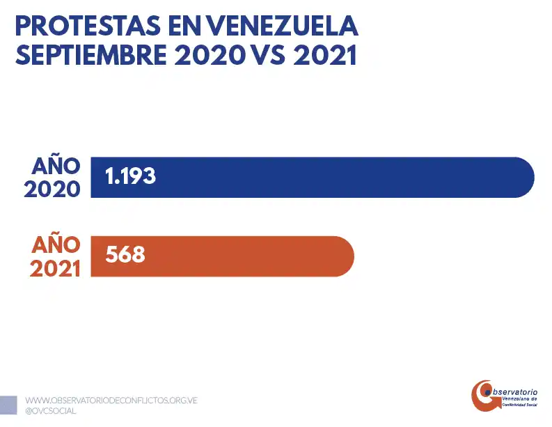 El Observatorio Venezolano de Conflictividad Social (OVCS) registró 568 protestas durante septiembre de 2021, equivalente a un promedio de 19 diarias. Esta cifra representa una disminución de 52% en comparación con septiembre de 2020, señaló la ONG.