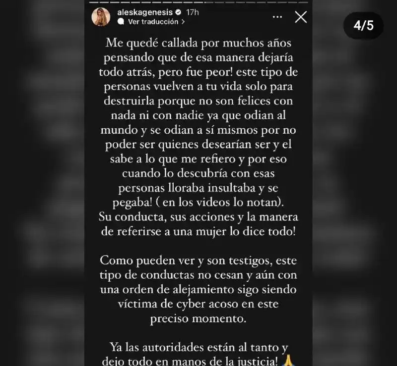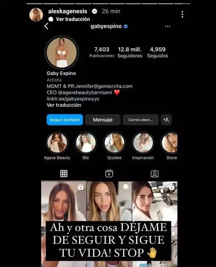 Recientemente, Aleska Génesis, le pidió públicamente a Gaby Espino que la dejara de seguir y que pusiera STOP a todo esto, su respuesta vino en consecuencia de las acusaciones por parte de Espino, que Génesis junto a sus hermanas contrataron a un presunto hacker para eliminar su cuenta.