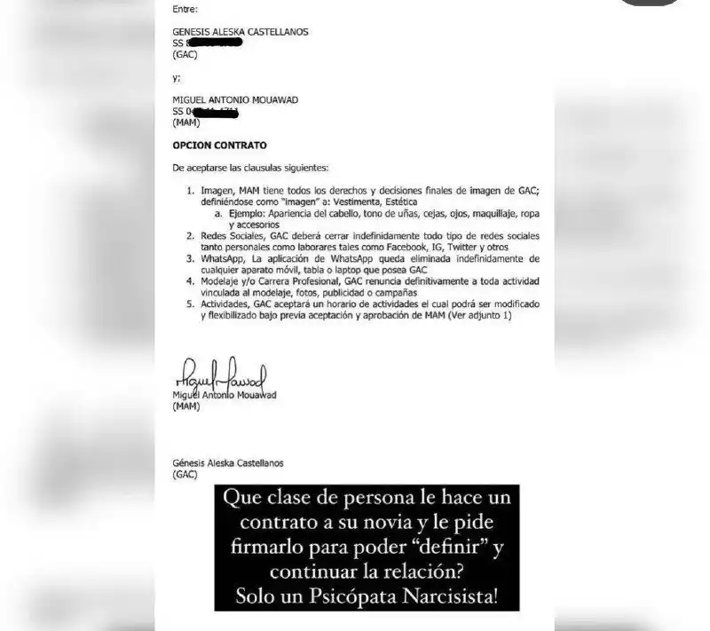 En el texto publicado por Aleska se pudo evidenciar que Mawad le solicitaba a la modelo renunciar a sus redes sociales, su WhatsApp. Sería el empresario el encargado de la forma de vestir de la venezolana.
