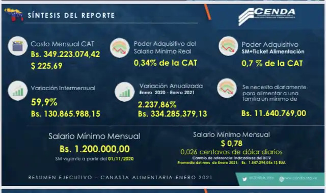 El reporte de Cenda de enero del 2021 indica que el costo mensual de la canasta alimentaria de los trabajadores (CAT) se ubicó en 349.223.074 el equivalente a $ 225,69.