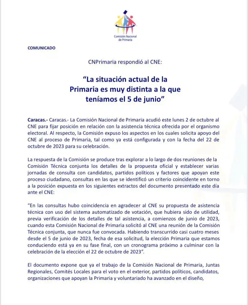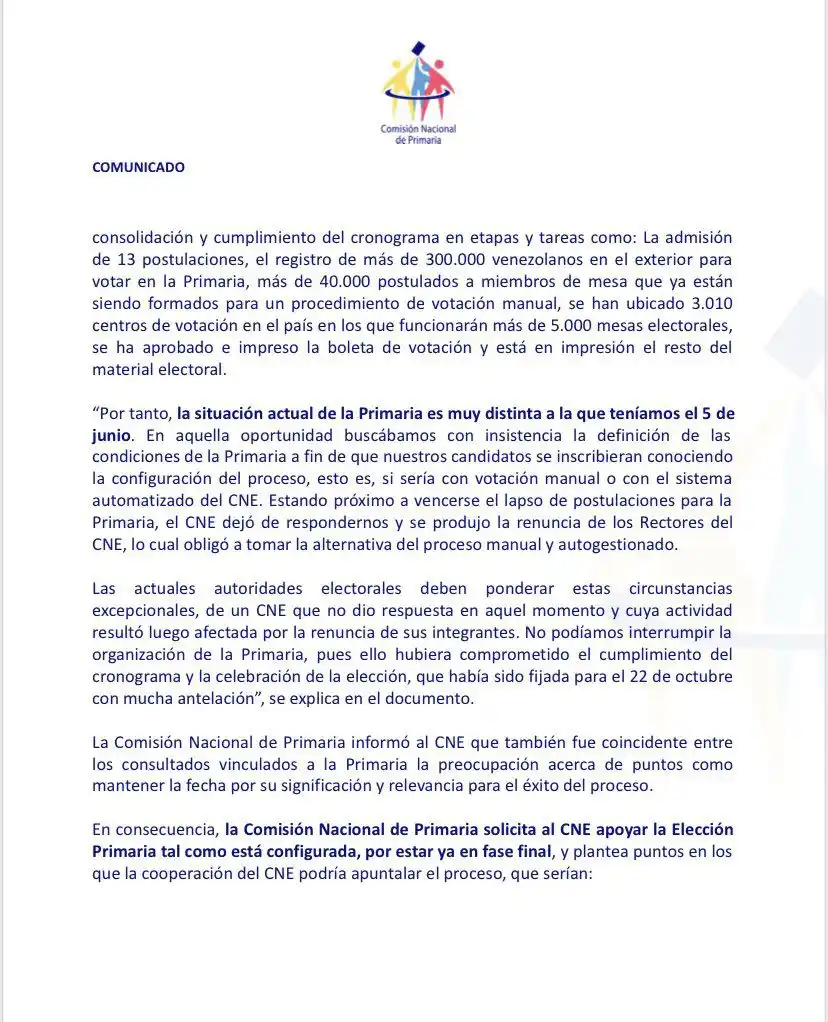 Pasadas las 12 de medio día de este lunes y luego de la reunión con el Consejo Nacional Electoral (CNE), la Comisión Nacional de Primarias (CNdP), emitió un comunicado en el cual hace una serie de peticiones al organismo comicial, pero aclarando que la fecha de la consulta se mantiene para el 22 de octubre.
