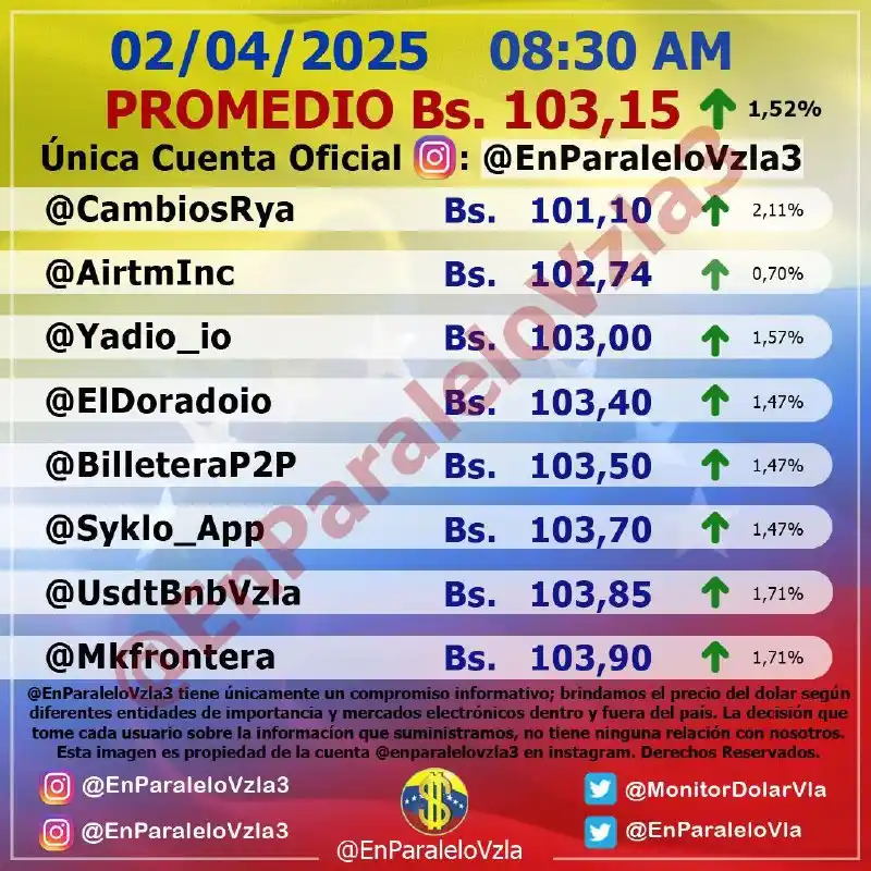 El dólar paralelo abrió al alza este 2 de abril y se ubicó en Bs. 103,15