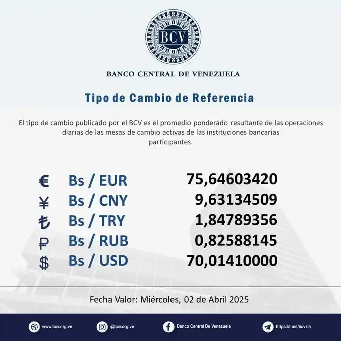 En los primeros tres meses de 2025, la cotización oficial aumentó un 32,7 %, es decir, de 52,57 bolívares a 69,77, de enero a marzo.