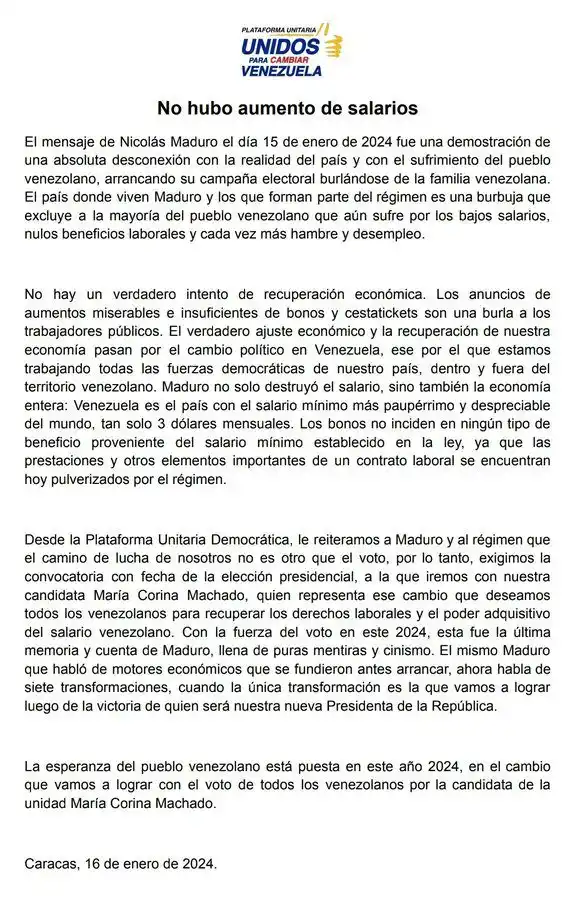 «Desde la Plataforma Unitaria Democrática, rechazamos el cinismo de Nicolás Maduro durante su mensaje ante la Asamblea Nacional», reza parte del comunicado de la Plataforma Unitaria, donde condenan que el aumento del ingreso haya sido por la vía de los bonos y no del salario mínimo.