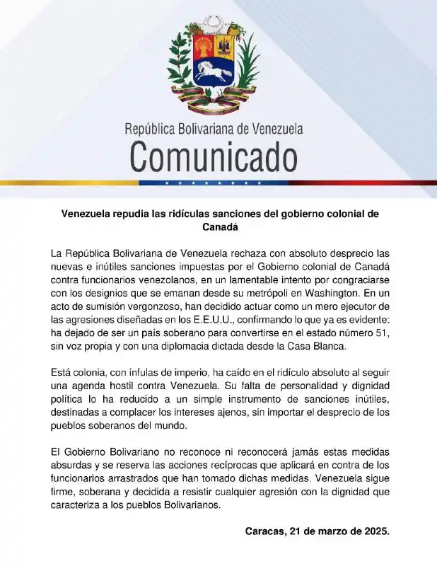«Venezuela rechaza con absoluto desprecio las nuevas e inútiles sanciones impuestas por el Gobierno colonial de Canadá contra funcionarios venezolanos, en un lamentable intento por congraciarse con los designios que se emanan desde su metrópoli en Washington», dice el escrito.