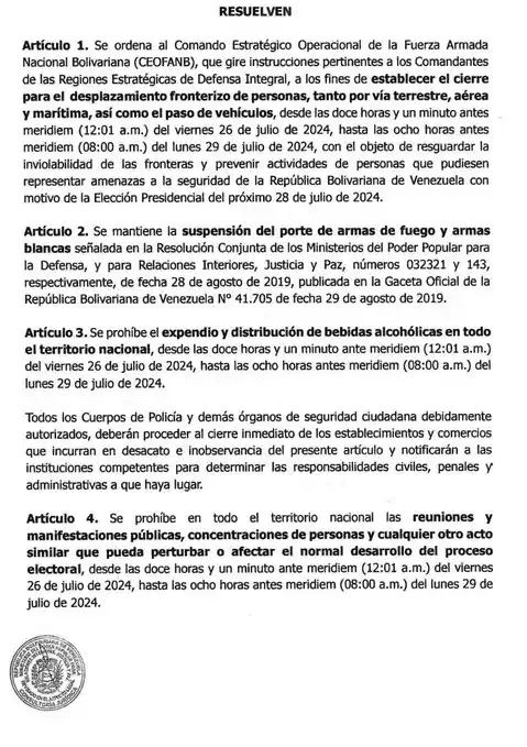 Desde la 1:00 de la madrugada de este 26 de julio y hasta la media noche del 29, permanecerán cerradas las fronteras de Venezuela, según consta en una resolución conjunta entre los ministerios de la Defensa y del Interior Justicia y Paz, debido a las elecciones del domingo 28 del mes en curso.