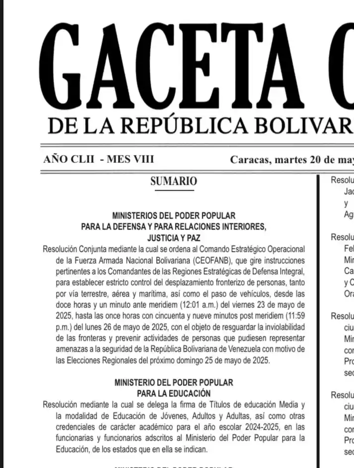«Se ordena al Comando Estratégico Operacional de la Fuerza Armada Nacional (Ceofanb) que gire instrucciones a los comandantes de las REDI para «establecer el estricto control de desplazamiento fronterizo de personas, tanto por vía terrestre, aérea y marítima, así como el paso de vehículos», destaca el texto de la resolución.