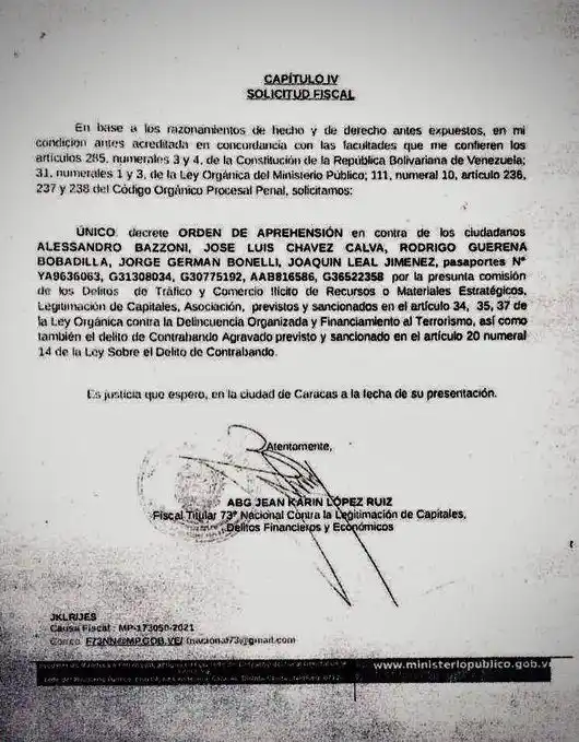 Según el documento, la solicitud del fiscal 73, López Ruiz, se hace sobre la base de “la presunta comisión de los delitos de tráfico y comercio ilícito de recursos o materiales estratégicos, legitimación de capitales, y asociación (para delinquir)”, y adicionalmente “el delito de contrabando agravado”.