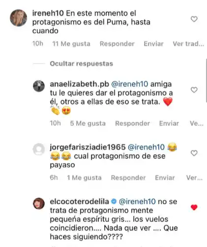 La usuaria @ireneh10 le escribió que no buscara protagonismo. «En este momento el protagonismo es del Puma, hasta cuándo». Además de recibir los reclamos de otros seguidores, la propia Lila le respondió.