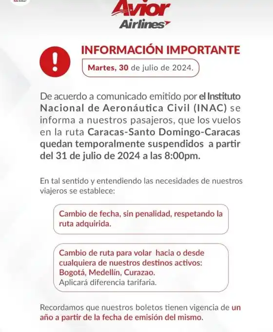 Una de ellas es Avior que, a través de sus redes sociales, informó a sus usuarios la suspensión de los vuelos con desde y hacia República Dominicana, en atención a las medidas del Instituto Nacional de Aeronáutica Civil (INAC).
