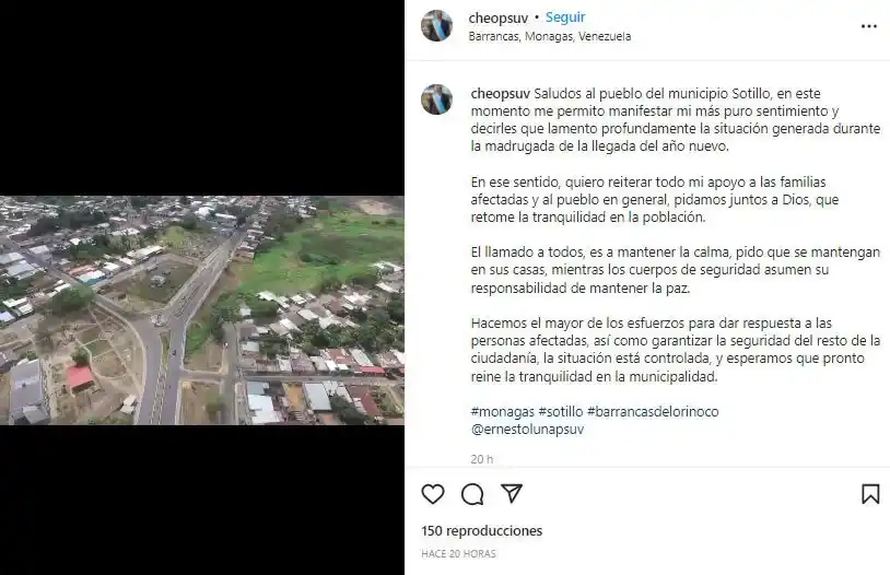 “Saludos al pueblo del municipio Sotillo, en este momento me permito manifestar mi más puro sentimiento y decirles que lamento profundamente la situación generada durante la madrugada de la llegada del año nuevo”.