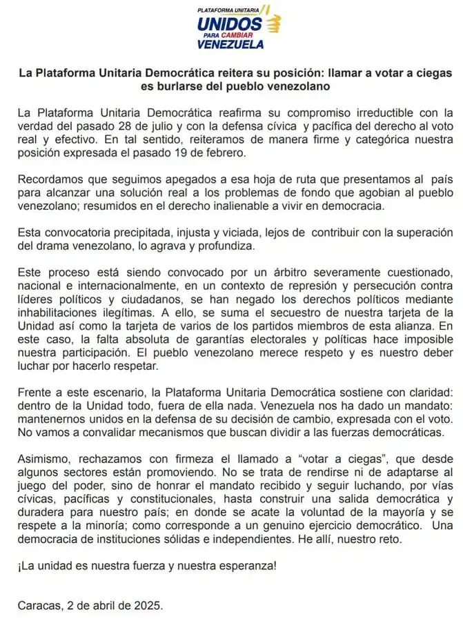 Mediante un comunicado, la coalición alerta que «llamar a votar a ciegas es burlarse del pueblo venezolano».