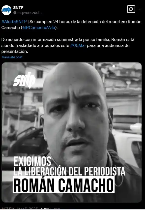 A través de sus redes sociales, el SNTP informó que “de acuerdo con información suministrada por su familia, Román está siendo trasladado a tribunales este #05Mar para una audiencia de presentación”