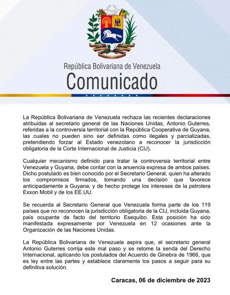 #Comunicado Venezuela rechaza las recientes declaraciones atribuidas al secretario general de las Naciones Unidas, Antonio Guterres, referidas a la controversia territorial con la República Cooperativa de Guyana, las cuales no pueden sino ser definidas como ilegales y… pic.twitter.com/bcaNMP8rVr