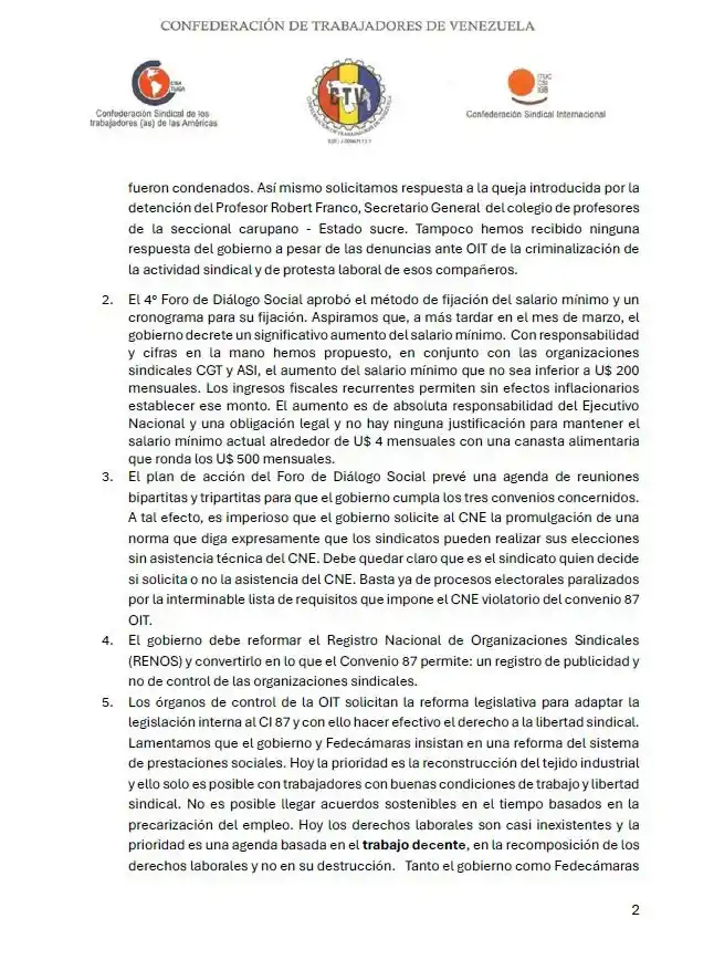Hay una propuesta conjunta de la Confederación de Trabajadores de Venezuela (CTV), la Confederación General del Trabajo (CGT) y la Alianza Sindical Independiente (ASI) Venezuela