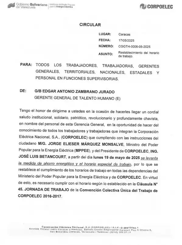 En la circular se señala que, «en virtud de esto, es necesario cumplir con el horario según lo establecido en la Cláusula N° 45. JORNADA DE TRABAJO de la Convención Colectiva Única del Trabajo de CORPOELEC 2016-2017».