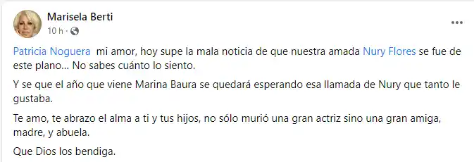 Por su parte, Marisela Berti, actriz que se recupera en México de un ACV, también la despidió. «Patricia Noguera mi amor, hoy supe la mala noticia de que nuestra amada Nury Flores se fue de este plano… No sabes cuánto lo siento. Y se que el año que viene Marina Baura se quedará esperando esa llamada de Nury que tanto le gustaba», le envió por Facebook a la hija de la actriz.