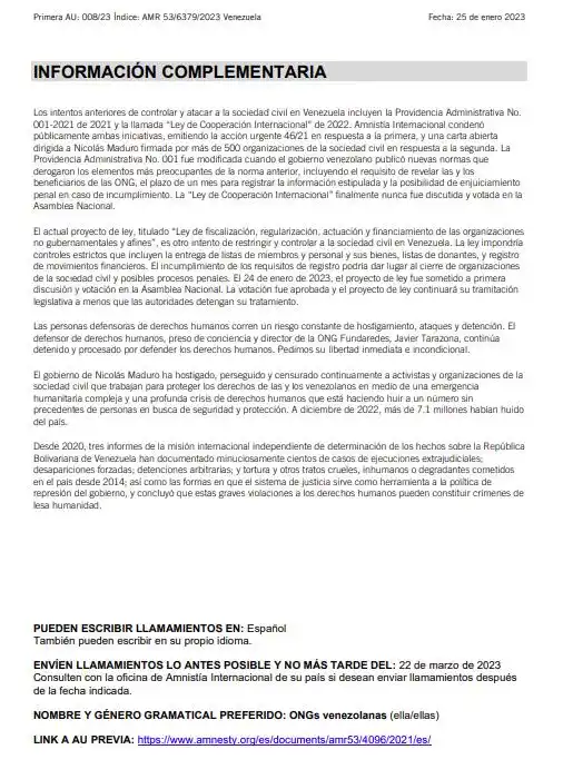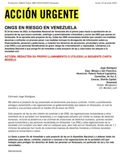 «Si se aprueba este proyecto de ley, todas las ONG venezolanas tendrán que cumplir con medidas abusivas o enfrentar un proceso penal. Las medidas incluyen la divulgación de información sobre su financiamiento, personal y gobierno, y violarían los derechos de asociación, privacidad y otros, poniendo a las ONG y sus beneficiarios en grave riesgo de criminalización y represalias“, alertó Amnistía.