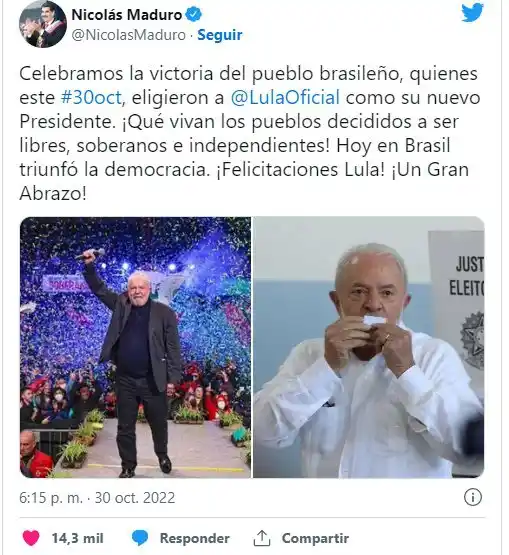 «Con satisfacción felicitamos en nombre del pueblo venezolano y del Pdte. @NicolasMaduro al compañero @LulaOficial, por su victoria el día de hoy, al ser electo como Pdte. de Brasil», refirió el canciller chavista Carlos Faria en un mensaje divulgado en Twitter.