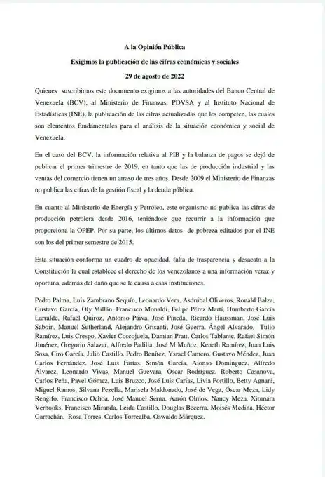 Esta es la razón de un comunicado público, suscrito por casi 70 personas, la mayoría economistas, como José Guerra, donde exigen a la administración de Nicolás Maduro publicar estas cifras «actualizadas, las cuales son elementos fundamentales para el análisis de la situación económica y social de Venezuela».