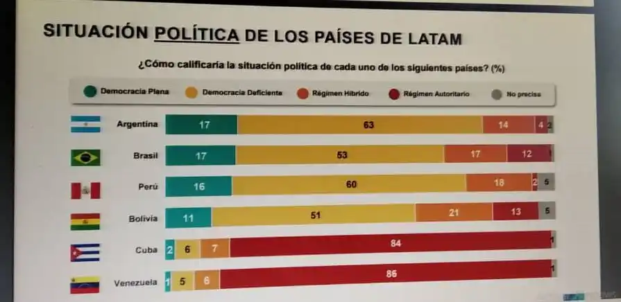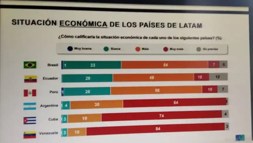 Según la encuesta Ipsos, Venezuela es percibida como «un régimen autoritario» y «una democracia deficiente», con un desempeño económico calificado como «malo» y «muy malo»