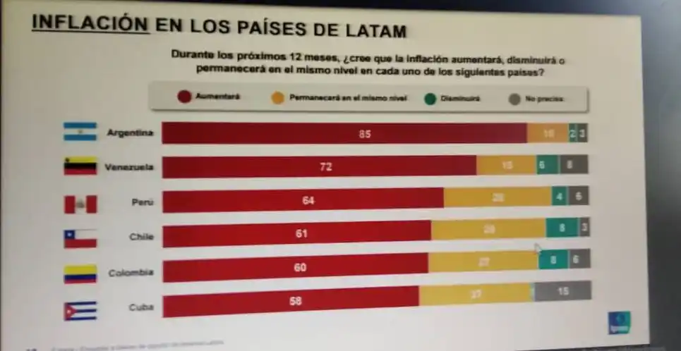 En el caso de Venezuela, la evaluación, desde el punto de vista económico, es la peor, puesto que según el estudio, 72% de los encuestados cree que aumentará inflación.