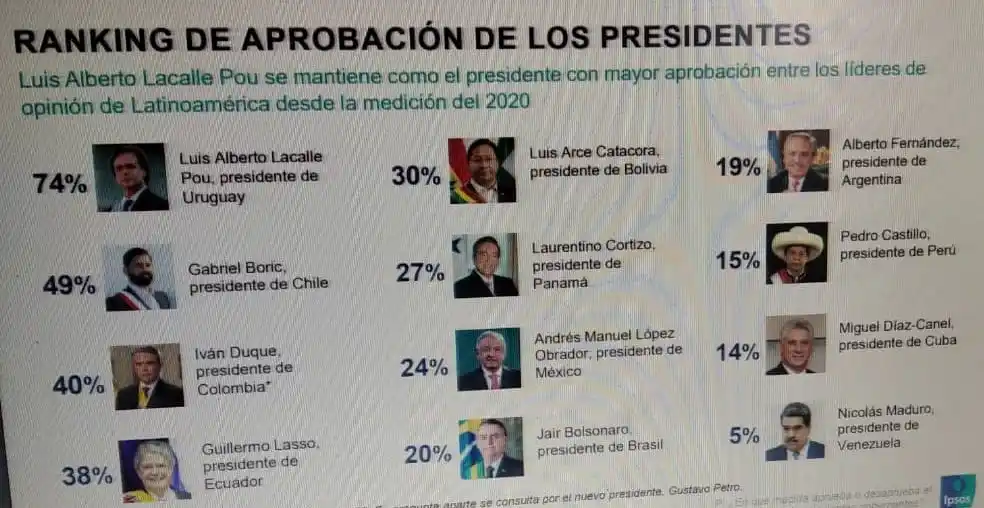 Mientras que Luis Alberto Lacalle Pou, presidente de Uruguay, «se ubica en el primer lugar del ranking de aprobación presidencial con 74%, seguido por Gabriel Boric de Chile con 49%».