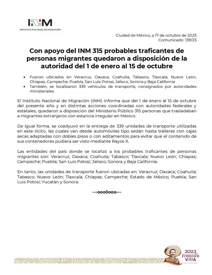 “Del 1 de enero al 15 de octubre del presente año y en distintas acciones coordinadas con autoridades federales y estatales, quedaron a disposición del Ministerio Público 315 personas que trasladaban a migrantes extranjeros con estancia irregular en México”, precisó el INM.