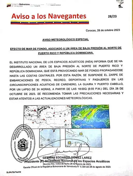 El INEA informó que se suspende hasta las 06:00 pm de este #29Oct "el zarpe de embarcaciones de pesca, recreo, deportivas y pasajeros en #Carenero, #LaGuaira y #PuertoCabello".https://t.co/qFmcFri3Pi