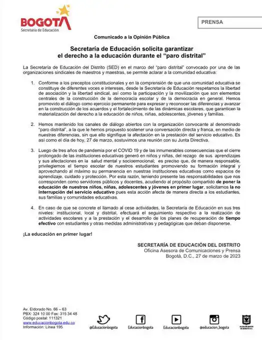 En el marco del paro convocado por una de las organizaciones sindicales de maestros y maestras, la Secretaría de Educación respondió con un comunicado: