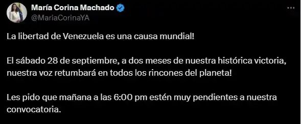 La líder opositora María Corina Machado informó de otra movilización global que tendrá efecto el sábado 28 de septiembre.