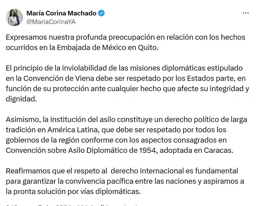 La líder opositora María Corina Machado manifestó este domingo su preocupación por el allanamiento de la Embajada de México en Ecuador y afirmó que «el principio de la inviolabilidad de las misiones diplomáticas estipulado en la Convención de Viena debe ser respetado por los Estados parte».